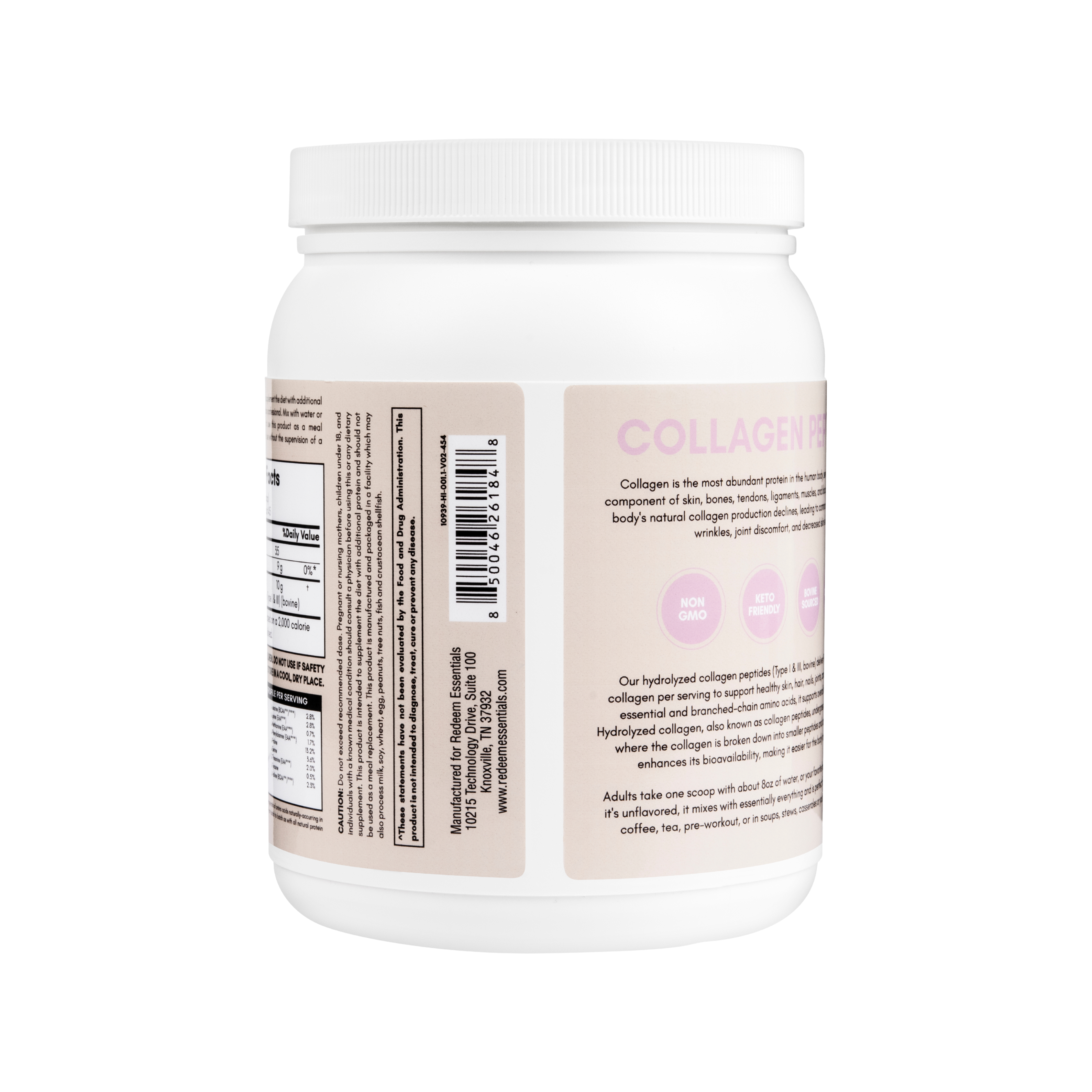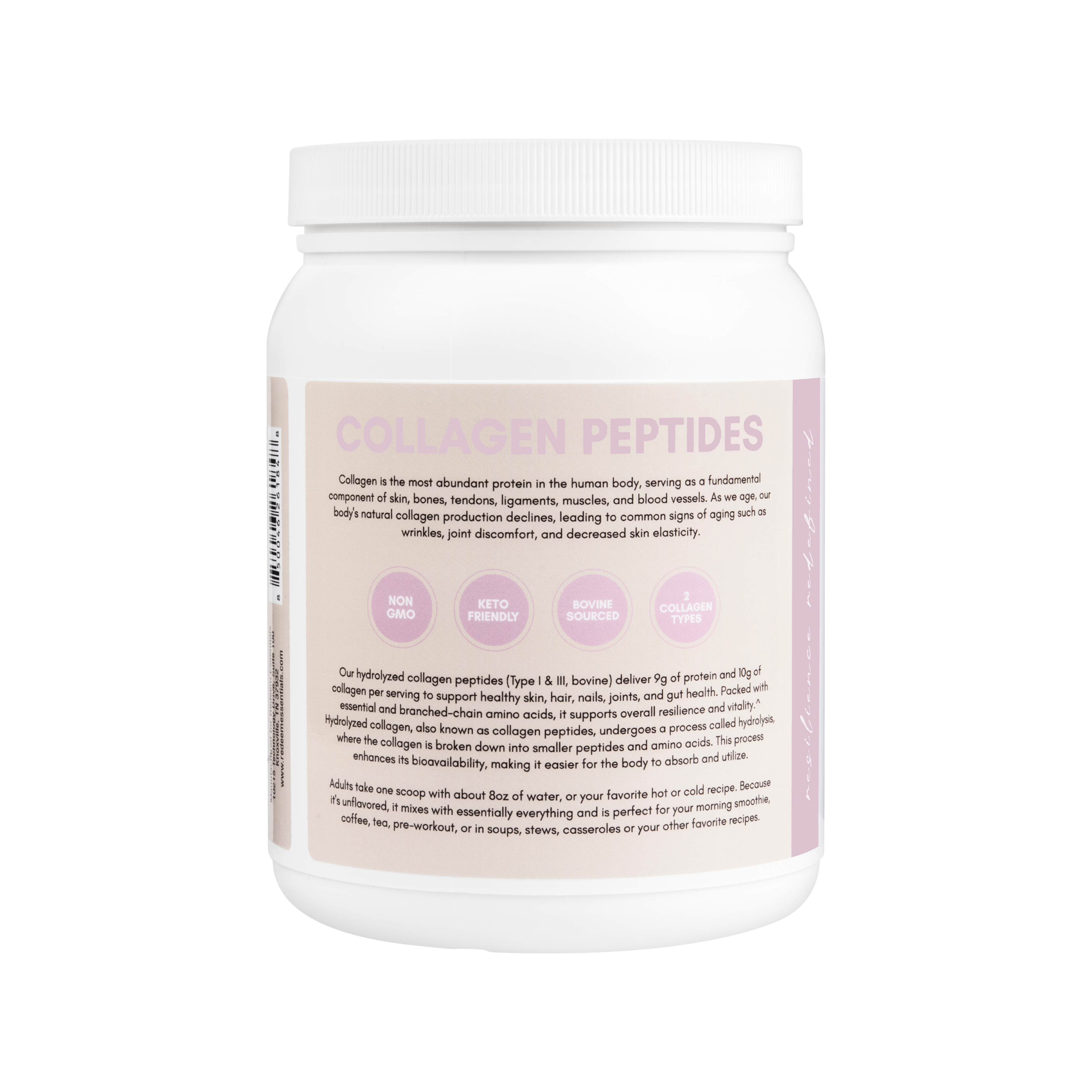 Our hydrolyzed collagen peptides (Type I & III, bovine) deliver 9g of protein and 10g of collagen per serving to support healthy skin, hair, nails, joints, and gut health. Packed with essential and branched-chain amino acids, it promotes overall resilience and vitality. Hydrolyzed collagen, also known as collagen peptides, undergoes a process called hydrolysis, where the collagen is broken down into smaller peptides and amino acids. This process enhances its bioavailability, making it easier for the body to absorb and utilize.