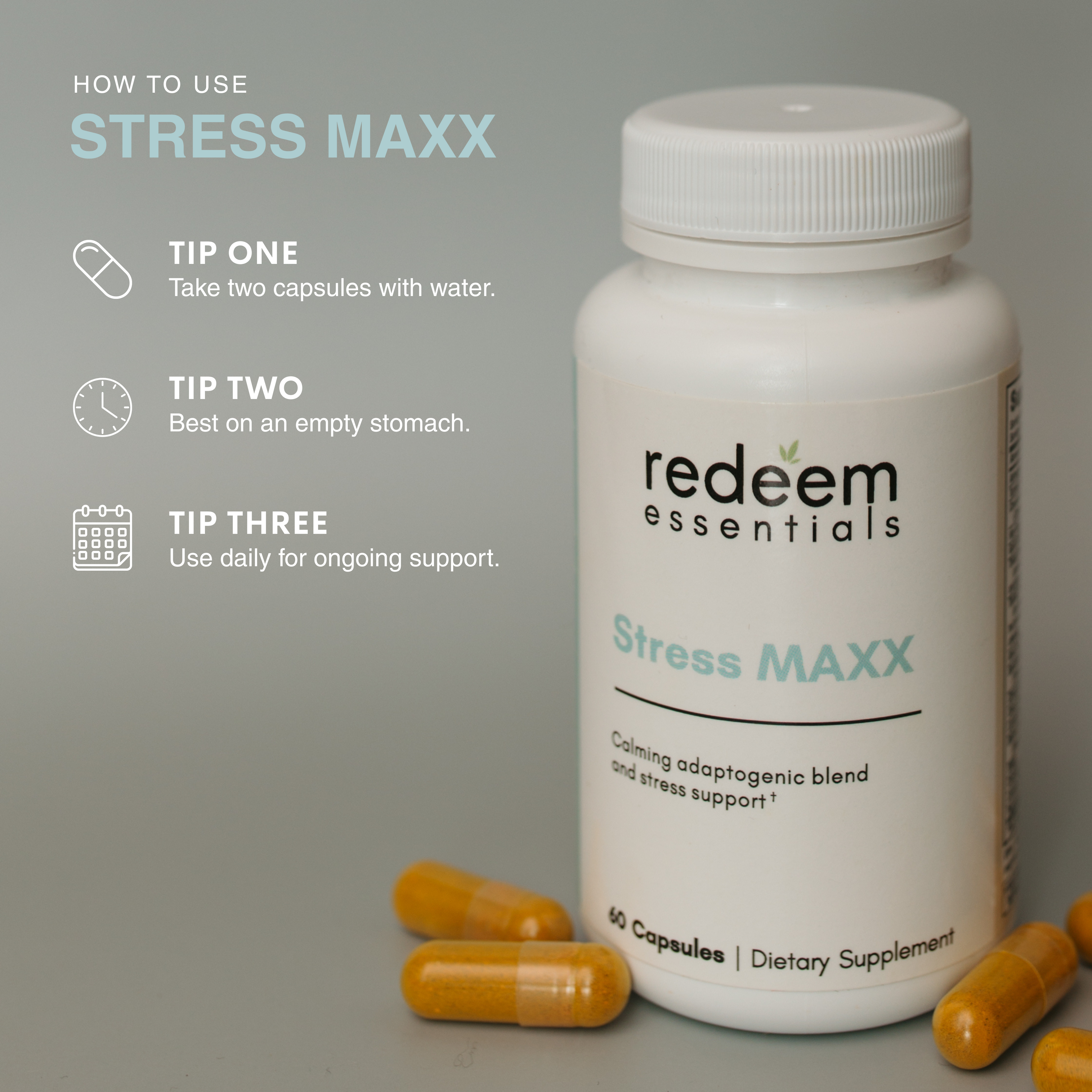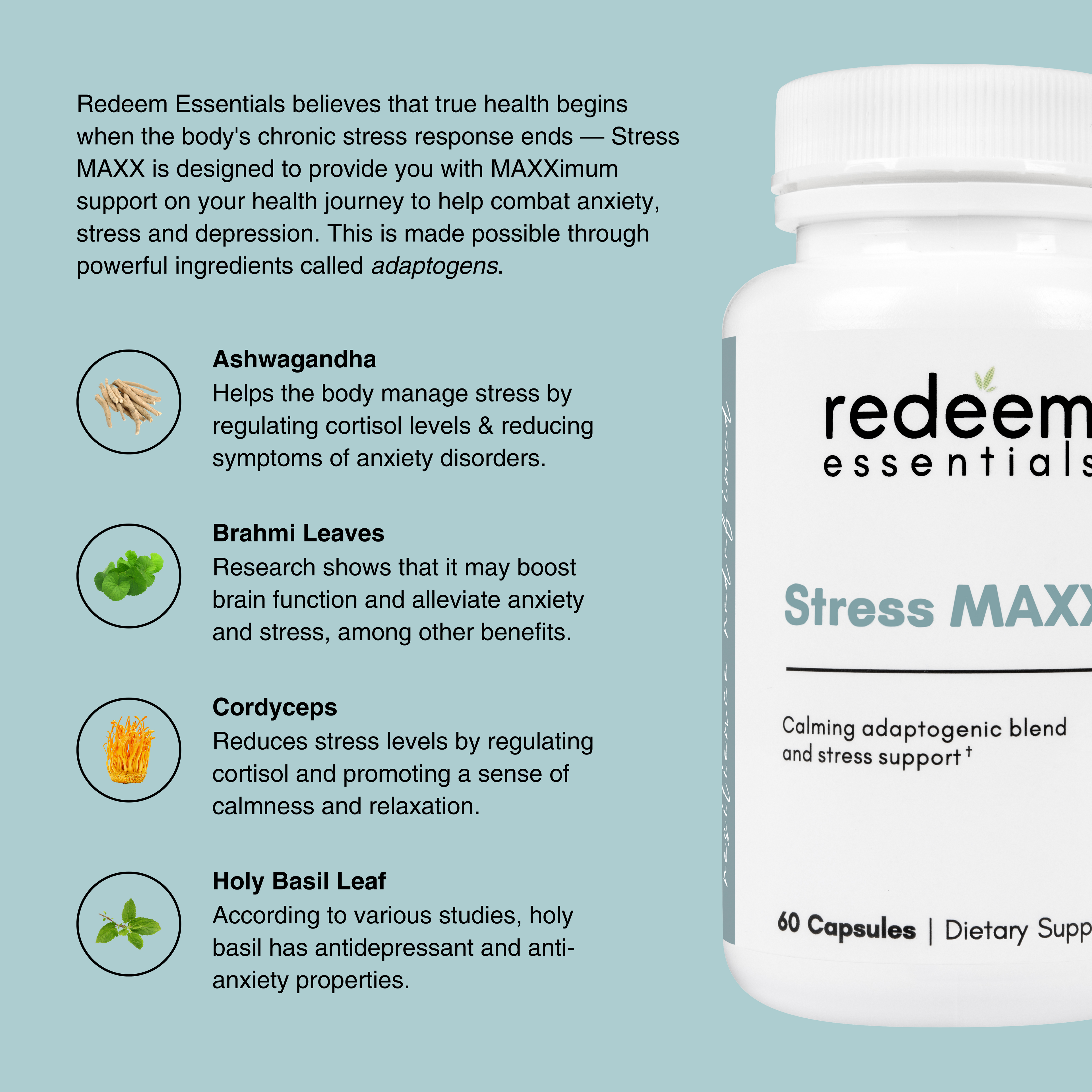 Redeem Essentials believes that true health begins when the body's chronic stress response ends — Stress MAXX is designed to provide you with MAXXimum support on your health journey to help combat anxiety, stress and depression. This is made possible through powerful ingredients called adaptogens.